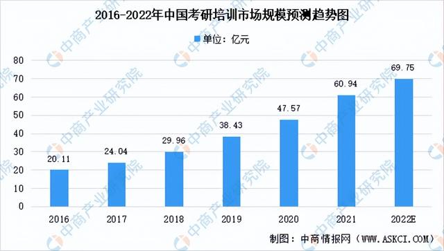 由于考研热的持续升温,一二级资本市场也对考研培训行业表现出青睐。2021年中国考研培训市场规模为60.94亿元,同比增长28.1%,预计2022年中国考研培训市场规模将达69.75亿元。随着市场需求的集中释放,考研报考人群不断扩大,报录比的攀升,参培率的不断提高,考研培训服务线上线下进一步融合深化发展等等,考研培训行业发展趋势正在明朗化且有着较大的成长空间。