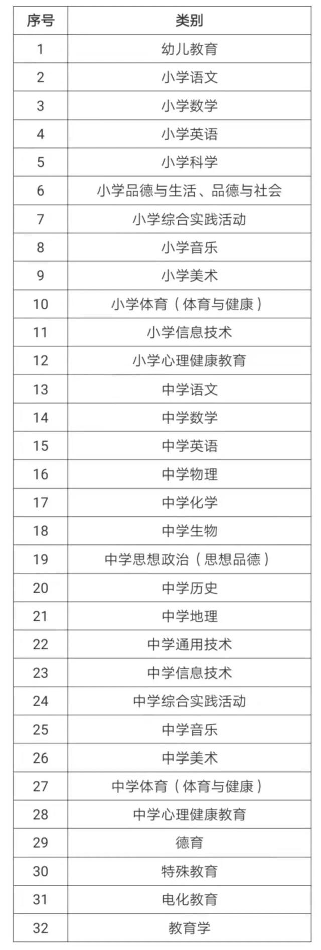教育教学能力水平考试设32个专业类别(见附件),其中中学语文、数学、英语、物理、化学、生物、思想政治(思想品德)、历史、地理等9学科按初中、高中分别命题,由教师按现任教学段(初中、高中)选择考试。中小学幼儿园教师按拟申报职称学科选择1个专业类别报考。
