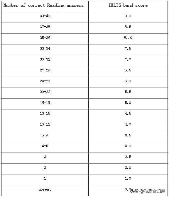 听力/阅读打分表(左边为对的个数,右边是对应的分数,听力阅读总共都是40个题,标准一样)