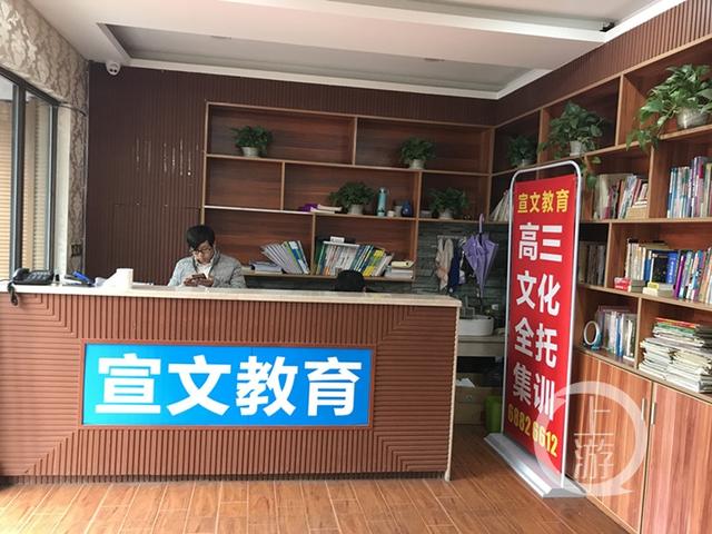 与之相邻的宣文教育也在黑名单中,周边几个挂着招牌的门面虽然关着,但其中一个却是开着的。进入大厅,有一名男生正拿着英语书在背单词。