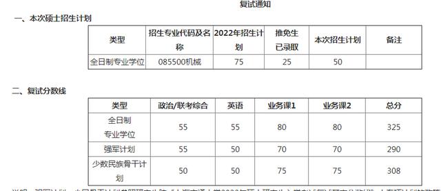 航空航天学院,机械专硕招生75人,复试线325,强军计划290,少干计划308。