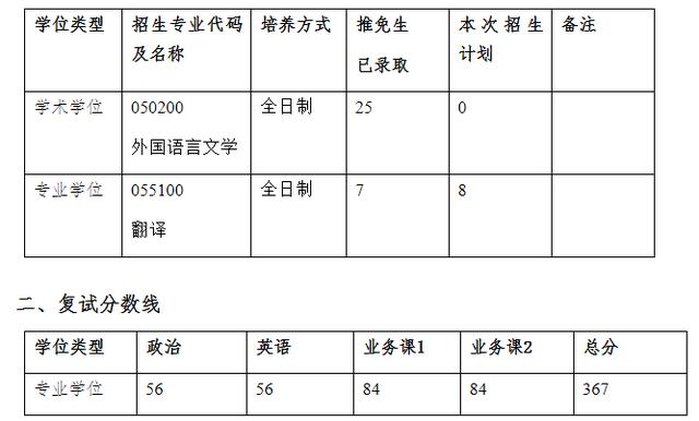 外国语学院。翻译招8人,分数线367,最高396,进复试人数8人。