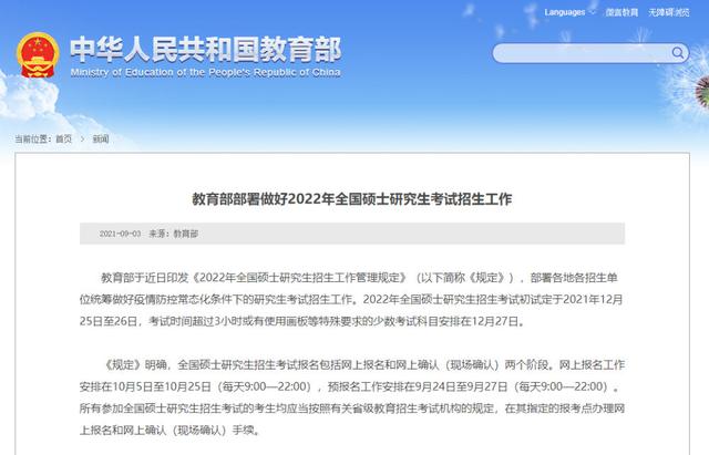 教育部于近日印发《2022年全国硕士研究生招生工作管理规定》(以下简称《规定》),部署各地各招生单位统筹做好疫情防控常态化条件下的研究生考试招生工作。2022年全国硕士研究生招生考试初试定于2021年12月25日至26日,考试时间超过3小时或有使用画板等特殊要求的少数考试科目安排在12月27日。