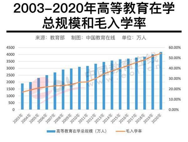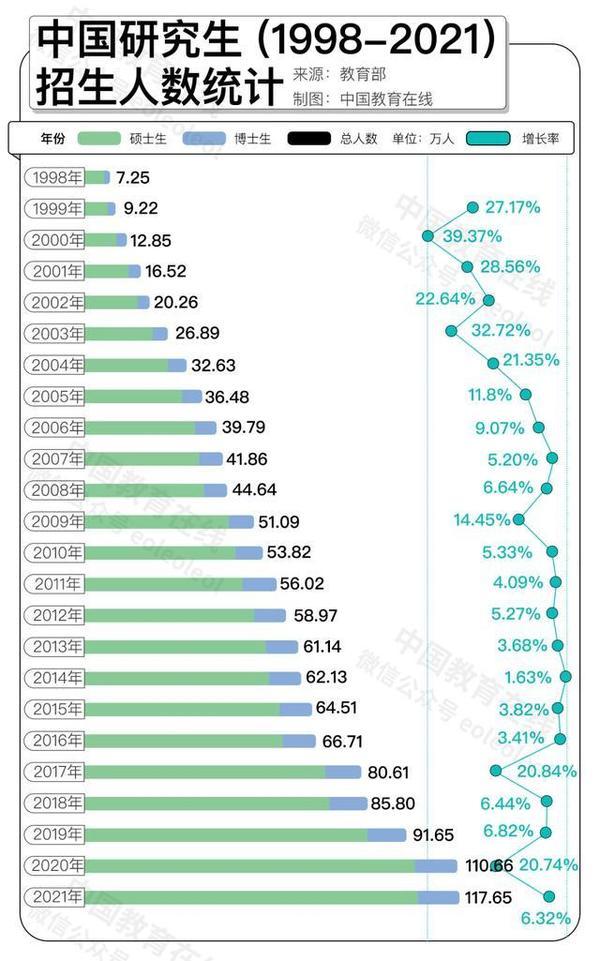 近几年来,为缓解就业压力,国家采取了系列扩招政策,包括研究生的扩招。研究生招生规模近年进入一个快速扩张期,仅2020年就扩招了19万,研究生招生110万人,2021年继续扩招,去年全国研究生招生人数逼近120万,达到了117.7万。