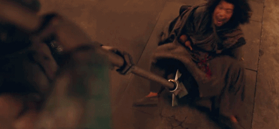 木偶从天而降,下半身如陀螺般飞速旋转,上半身或四臂飞刀,或恃戟行凶。