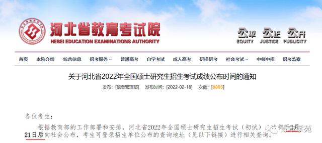 河北省2022年全国硕士研究生招生考试(初试)成绩将于2月21日后向社会公布。