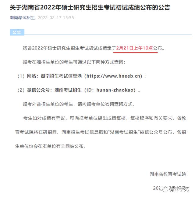 湖南省2022年硕士研究生招生考试初试成绩定于2月21日上午10点公布。