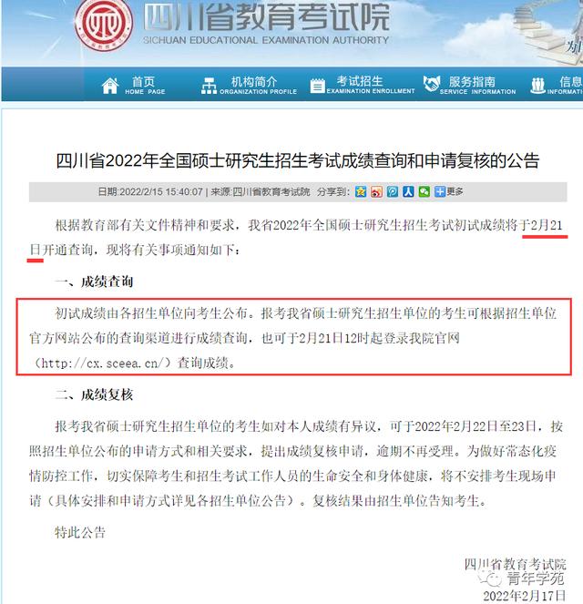 四川省2022年全国硕士研究生招生考试初试成绩将于2月21日开通查询。