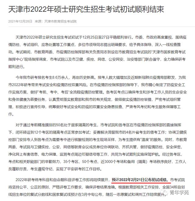 我区2022年硕士研究生初试成绩将于2月21日后由招生单位向考生发布。