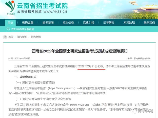 云南省2022年全国硕士研究生招生考试初试成绩将于2022年2月21日公布。