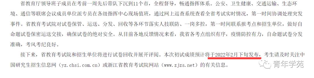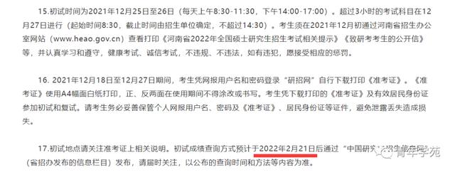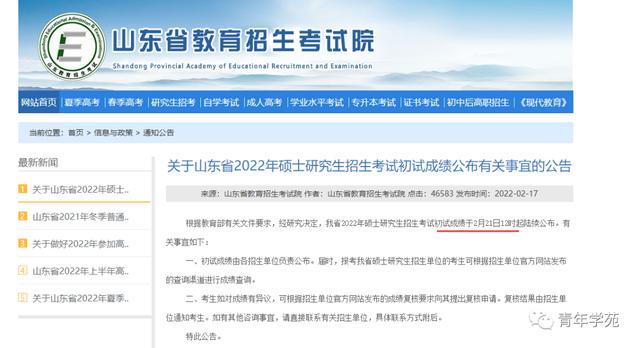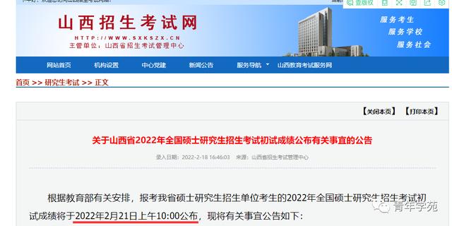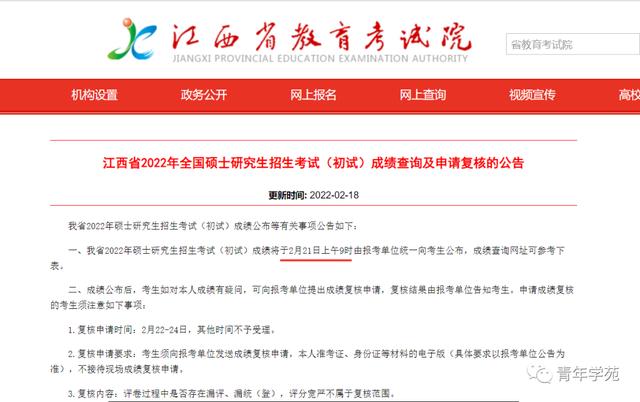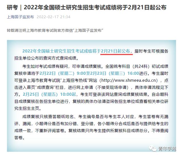 报考我省硕士研究生招生单位考生的2022年全国硕士研究生招生考试初试成绩将于2022年2月21日上午10:00公布。