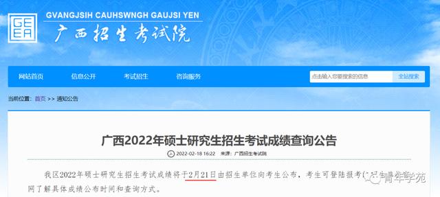 广西2022年硕士研究生招生考试成绩将于2月21日由招生单位向考生公布,考生可登录报考的招生单位官网了解具体成绩公布时间和查询方式。