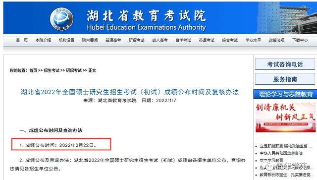 根据教育部2022年全国硕士研究生招生考试(初试)工作安排和要求,我省2022年全国硕士研究生招生考试(初试)成绩将于2月21日12:00后开通查询。