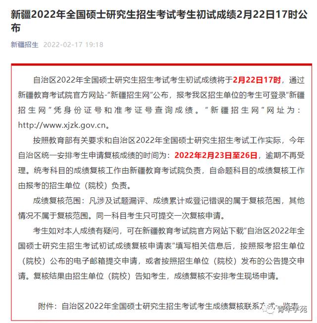 自治区2022年全国硕士研究生招生考试考生初试成绩将于2月22日17时,通过新疆教育考试院官方网站-“新疆招生网”公布。