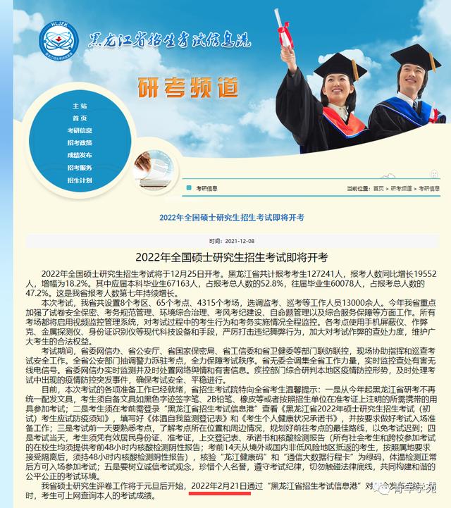 我省硕士研究生评卷工作将于元旦后开始,2022年2月21日通过“黑龙江省招生考试信息港”对社会发布成绩,届时,考生可上网查询本人的考试成绩。