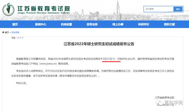 江苏省2022年全国硕士研究生招生考试初试成绩将于2月21日15:00起向社会公布。