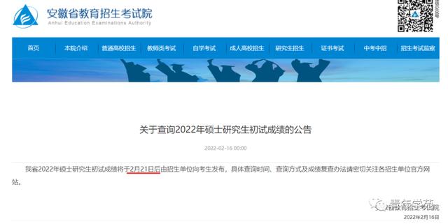 安徽省2022年硕士研究生初试成绩将于2月21日后由招生单位向考生发布,具体查询时间、查询方式及成绩复查办法请密切关注各招生单位官方网站。