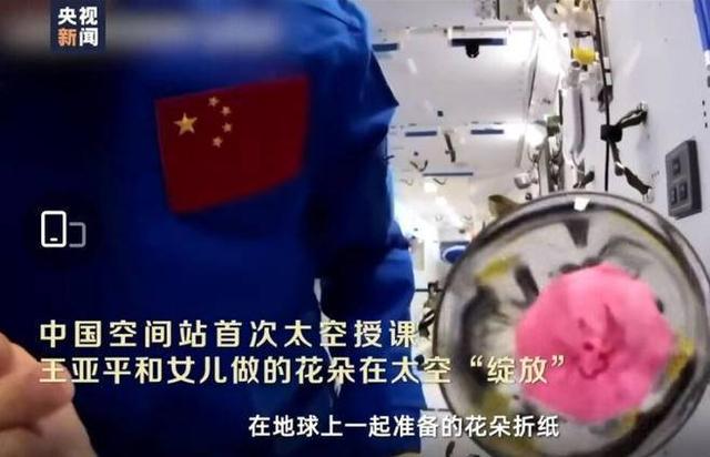 在中国空间站王亚平的睡眠区,挂着她和家人的照片,还有女儿送给她的小玩偶。在中国空间站首次太空授课时,王亚平将她和女儿在地球上一同制作的花朵折纸放进水膜,让女儿亲手做的花朵折纸在太空“绽放”。