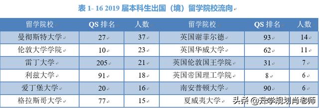 本科生出国(境)留学院校主要为曼彻斯特大学(37 人)、伦敦大学学院(23 人)、雷丁大学(21 人)、利兹大学(18 人)等,本科生具体留学院校分布如下表所示。
