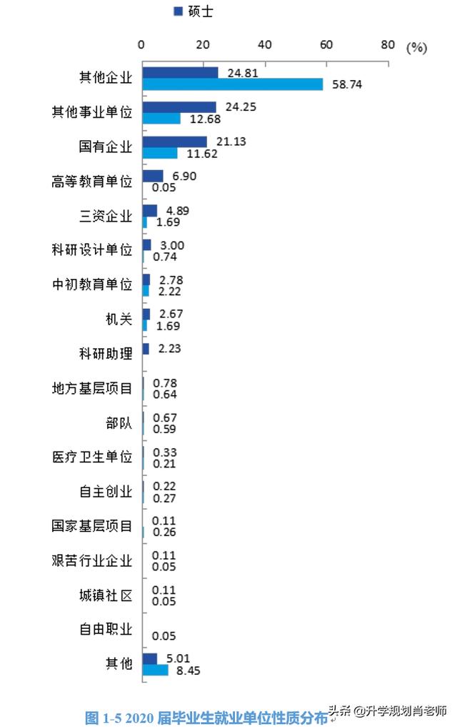 本科生:其他企业58.74%,其他事业单位12.68%,国有企业11.62%。
