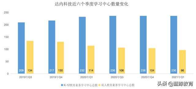 与之相比,成人教育业务处于持续收缩状态。成人教育中心总数由2019年Q3的134所,减少至2021年Q1的96所。对比来看,K12编程教育业务的学习中心总数由209所增加至236所。