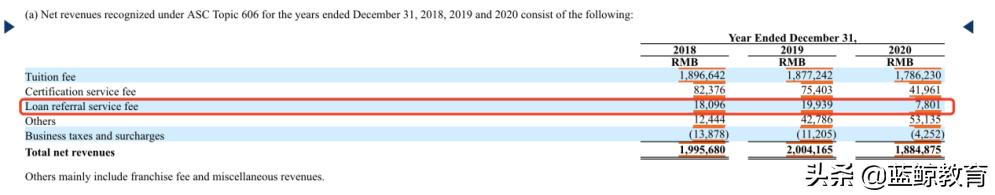蓝鲸教育发现,2018-2020年,达内科技贷款转介服务费收入分别是1809.6万元、1993.9万元、780.1万元,共计4583.6万元。