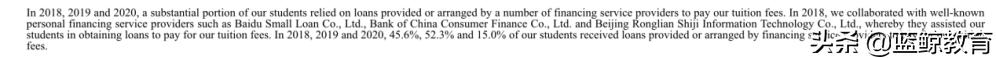 贷款逾期的另一边,通过向学生推荐金融机构,达内科技却可以获得不少“回报”。蓝鲸教育查询发现,在2020年财报中,达内科技表示向学生推广金融机构的贷款产品,公司以实际贷款本金的比率获得了贷款转介服务收入,并且每月与金融服务提供商确认。