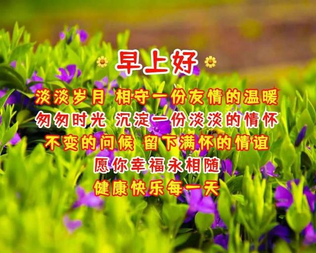 4、淡淡岁月,相守一份友情的温暖。匆匆时光,沉淀一份淡淡的情怀,不变的问候,留下满怀的情谊,愿你:幸福永相随,健康快乐每一天!早上好!
