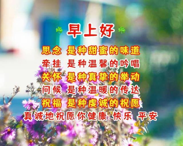 5、早上好!思念,是种甜蜜的味道;牵挂,是种温馨的吟唱;关怀,是种真挚的举动;问候,是种温暖的传达;祝福,是种虔诚的祝愿。亲爱的朋友,真诚地祝愿你健康,快乐,平安。