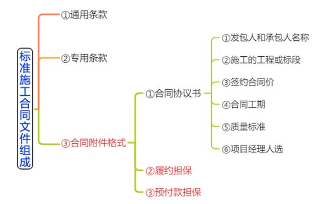 标准施工合同中给出的合同附件格式,是订立合同时采用的规范化文件,包括 ①合同协议书、②履约担保和③预付款担保三个文件。