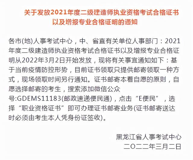 黑龙江二级建造师限制专业吗(黑龙江考二级建造师条件) 黑龙江的二级建造师证书可以领取啦! 近日,黑龙江人事考试网发布了关于2021年度二建考试合格证书以及增报专业合格证明的相关通知,具体内容如下: 有需要的朋友,记得准备好相关的资料,及时领取。