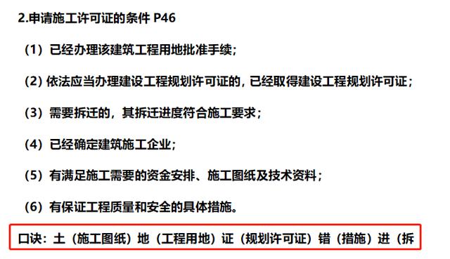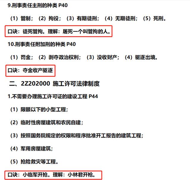 比如像什么措施项目费有九项,口诀是“二大爷脚已冻特安定”。我第一次听得时候,感觉傻不拉几的,什么玩意儿,后面复习的时候想了想还是很管用的。比如遇到选择题,起码是有印象的,如果是简答题中的补充题,你起码知道哪些已经给你了,你需要补充哪些。再比如,施工过程质量检测试验应依据施工流水段划分、工程量、施工环境及质量控制的需要确定抽检频次,简称为“流量失(施)控”,你可以记成每个月的手机流量都用的超标了,失控了。类似的还有很多,大部分都是那些讲课老师编的,你也可以自己编一些好记得,只要考试能记住,考完忘光光无所谓的。