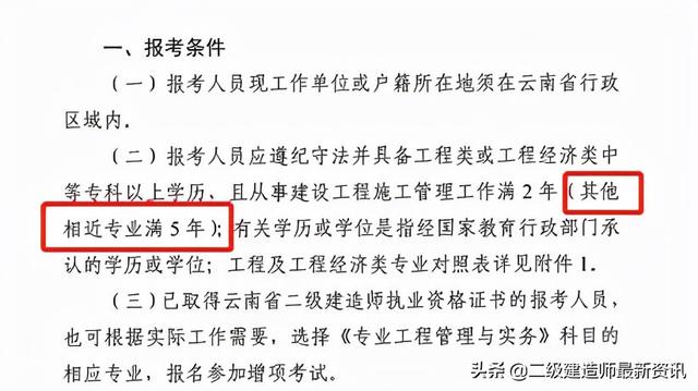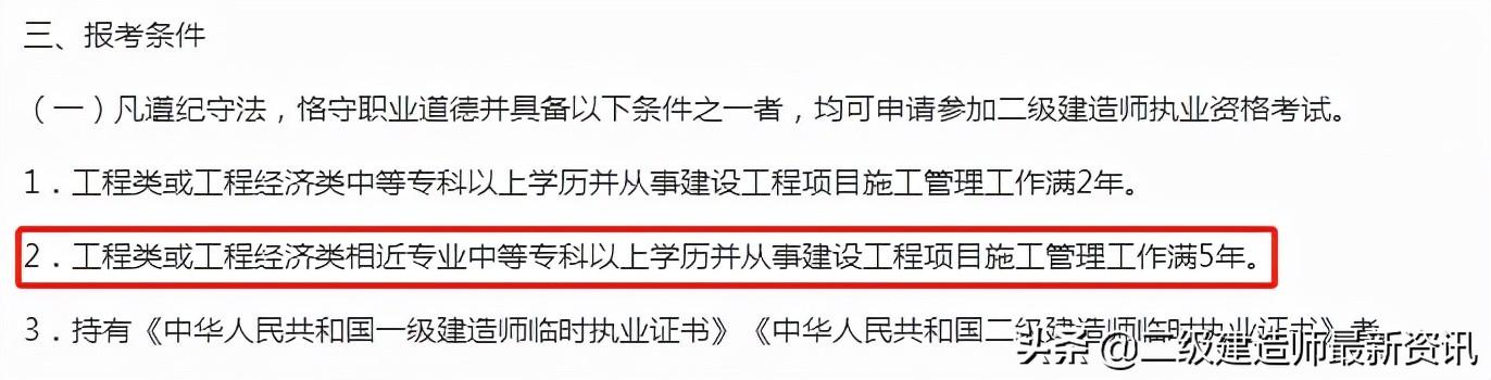 山东要求与工程类专业相近,中等专科以上学历并从事工程项目管理工作满5年就可以报考二建考试。