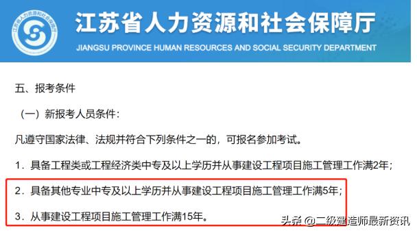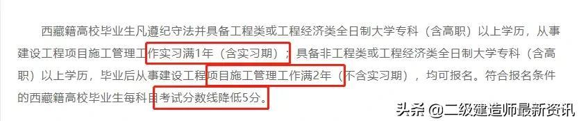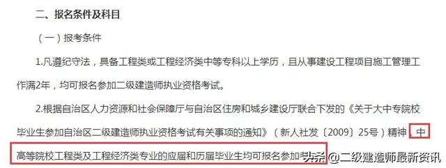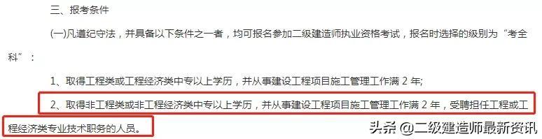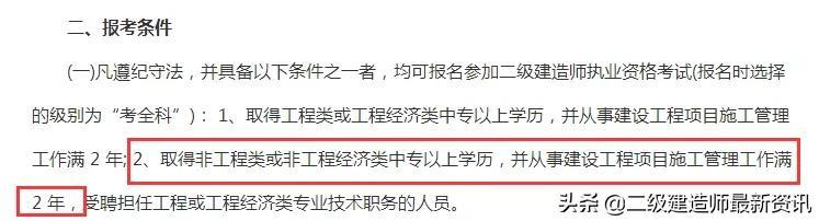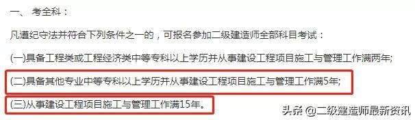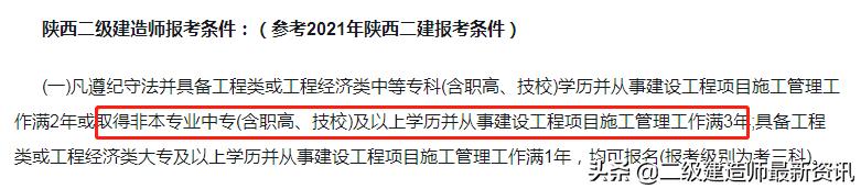 陕西省要求非工程类专业中专(含职高、技校)及以上学历并从事建设工程项目施工管理工作满3年就可以报考二建考试。
