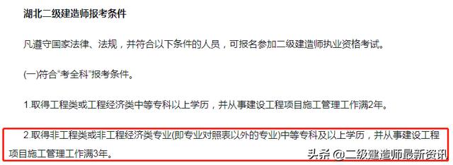 湖北省要求非工程类或非工程经济类专业(即专业对照表以外的专业)中等专科及以上学历,并从事建设工程项目施工管理工作满3年就可以报考二建考试。