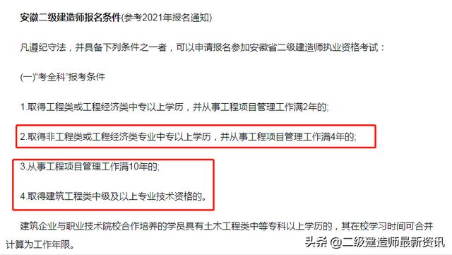 安徽省二建考试要求非工程类或工程经济类专业中专以上学历,并从事工程项目管理工作满4年的;从事工程项目管理工作满10年的;取得建筑工程类中级及以上专业技术资格的等就可以报考二建考试。