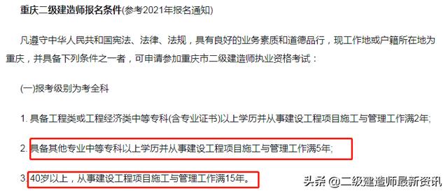 重庆市要求具备其他专业中等专科以上学历并从事建设工程项目施工与管理工作满5年;40岁以上,从事建设工程项目施工与管理工作满15年就可以报考二建考试。