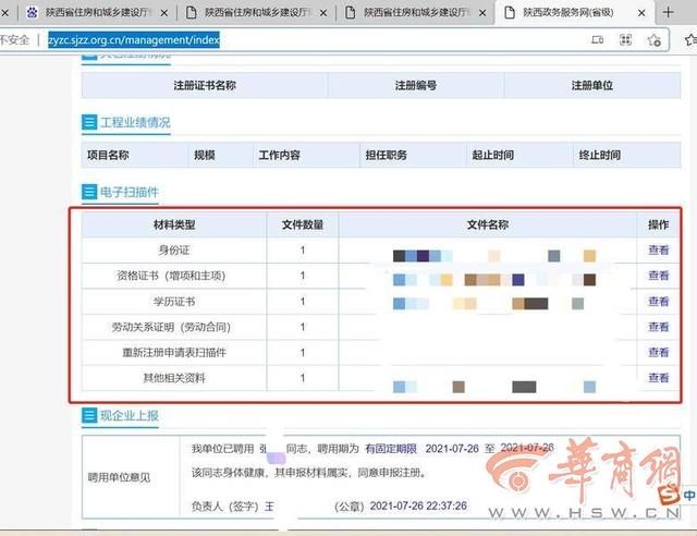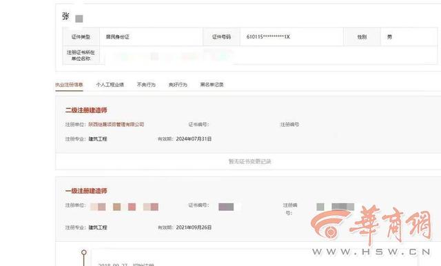 10月14日上午,华商报记者见到了张先生。通过张先生此前在国家住房和城乡建设部政务服务门户网查询到的资料显示,张先生的一级建造师执业资格认定的延续申请卡在了最后一步,“2021/09/08审查不通过:已作为【二级注册建造师】在陕西继晟项目管理有限公司注册”。另外,他的执业注册信息显示,一级注册建造师,有限期“2021年9月26日”;二级注册建造师,注册单位“陕西继晟项目管理有限公司”,有效期“2024年7月31日”。张先生说,“这些资格证有效期都是3年,所以继晟公司大概是在2021年7月底前后盗用了我的二建资格证。那个时间点,一建资格证还没过期,不知道他们用什么手段通过了审核。”