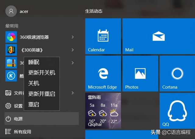 1.在Windows 10上单击“开始”按钮,单击“电源”菜单。