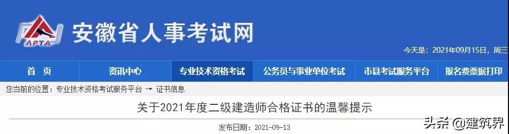 9月13日,安徽人事考试网发布二建证书领取提示。具体内容如下: