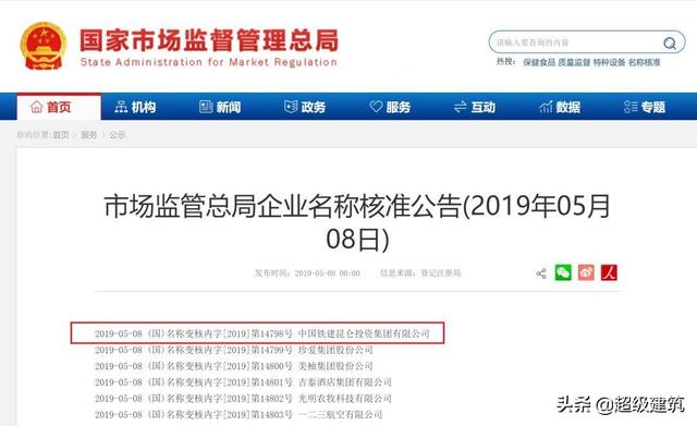 5月8日,国家市场监管总局公布一批企业名称核准公告,其中2019-05-08 (国)名称变核内字[2019]第14798号,为中国铁建昆仑投资集团有限公司。见下面截图。