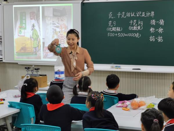 这是要做啥?原来,这节二年级四单元的《克、千克的认识与计算》,正是要教给小朋友们“度量衡”。在讲台上的小天平之后,崔玉秋老师让学生们亲手掂一掂,从硬币、纽扣到花生,“你感觉它们重吗?”小同学纷纷回答,“不重不重”“很轻很轻”“像没有重量一样”……崔老师告诉他们,实际上一枚2分硬币重约1克,也写成1g。相比之下,桌子上的那袋食盐重500克,2袋就是1000克,也写成1千克、1kg。