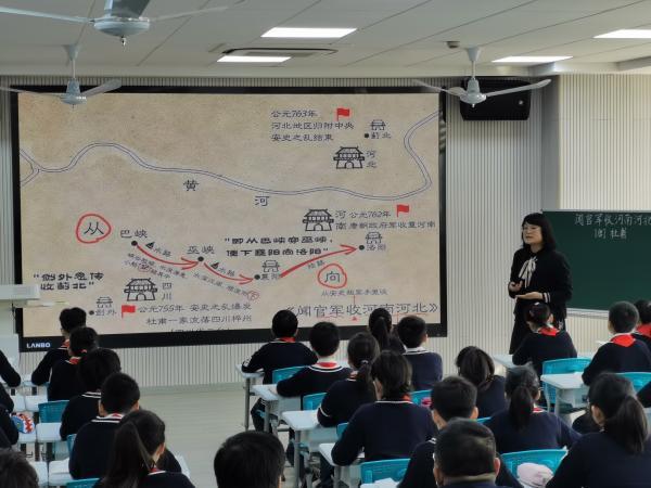 杜甫的这首诗正是五年级四单元那一课,小学生初一看就容易被那么多地名难倒。作为教育部中小学名师领航工程“宁锋名师工作室”主持人,宁老师有备而来,她从设问开始,请同学自报地名,随后再打开制作精良的“历史地图”幻灯片。学生们发现,“剑外”泛指剑门关以南,在四川;蓟北,确实是今天河北北部,但其实专指安史之乱叛军的根据地所在。一条清晰的“回归之路”展示在学生眼前,远在蜀地流落的杜甫,听闻唐军收复北方失地,高兴得只想着顺江而下,穿越两峡,再经陆路,返回都城。