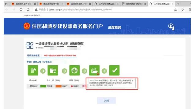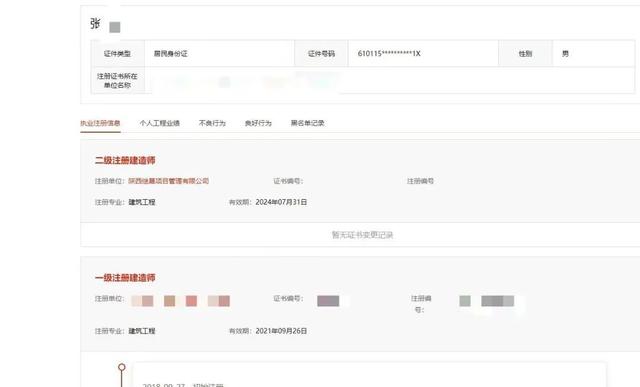通过张先生此前在住房和城乡建设部政务服务门户网查询到的资料显示,张先生的一级建造师执业资格认定的延续申请卡在了最后一步,“2021/09/08审查不通过:已作为【二级注册建造师】在陕西继晟项目管理有限公司注册”。另外,他的执业注册信息显示,一级注册建造师,有限期“2021年9月26日”;二级注册建造师,注册单位“陕西继晟项目管理有限公司”,有效期“2024年7月31日”。