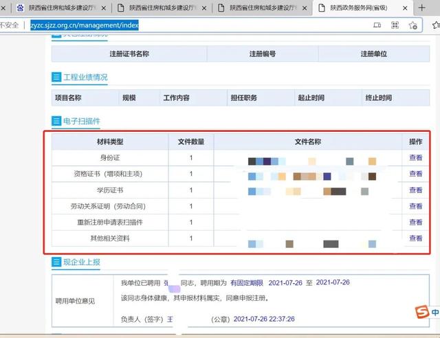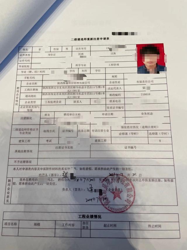 通过张先生提供的资料,记者发现,省住建厅综合服务中心官网提交的身份证正面照,是他早已过期的身份证,而背面照却显示“有效期:2019.07.27—2039.07.27”;《劳动聘用合同》上有“陕西继晟项目管理有限公司”印章,时间为“2021年7月20日”,另外还有张先生的“签名”;《二级建造师重新注册申请表》上,不仅有继晟公司印章,还有公司法定代表人梁某的签字,时间为“2021年7月20日”……