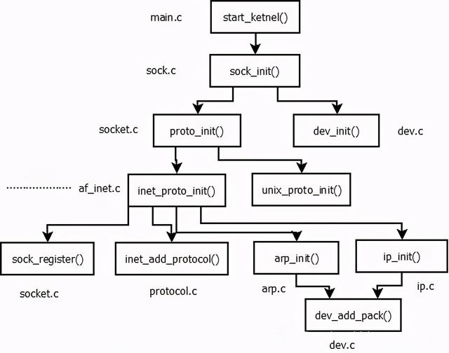 void sock_init(void)//网络栈初始化{int i; printk("Swansea University Computer Society NET3.019\\n"); /* *Initialize all address (protocol) families. */ for (i = 0; i < NPROTO; ++i) pops[i] = NULL; /* *Initialize the protocols module. */ proto_init(); #ifdef CONFIG_NET/* *Initialize the DEV module. */ dev_init(); /* *And the bottom half handler */ bh_base[NET_BH].routine= net_bh;enable_bh(NET_BH);#endif }