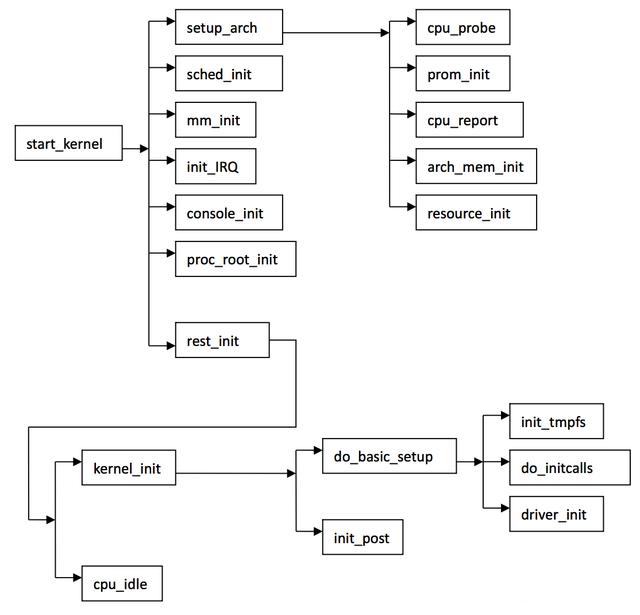 这需要从内核启动流程说起。当内核完成自解压过程后进入内核启动流程,这一过程先在 arch/mips/kernel/head.S 程序中,这个程序负责数据区(BBS)、中断描述表(IDT)、段描述表(GDT)、页表和寄存器的初始化,程序中定义了内核的入口函数 kernel_entry()、kernel_entry() 函数是体系结构相关的汇编代码,它首先初始化内核堆栈段为创建系统中的第一过程进行准备,接着用一段循环将内核映像的未初始化的数据段清零,最后跳到 start_kernel() 函数中初始化硬件相关的代码,完成 Linux Kernel 环境的建立。