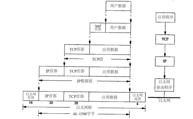 封装:当应用程序用 TCP 协议传送数据时,数据首先进入内核网络协议栈中,然后逐一通过 TCP/IP 协议族的每层直到被当作一串比特流送入网络。对于每一层而言,对收到的数据都会封装相应的协议首部信息(有时还会增加尾部信息)。TCP 协议传给 IP 协议的数据单元称作 TCP 报文段,或简称 TCP 段(TCP segment)。IP 传给数据链路层的数据单元称作 IP 数据报(IP datagram),最后通过以太网传输的比特流称作帧(Frame)。