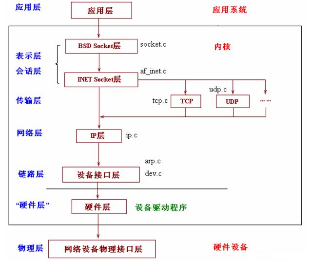 网络协议层(Network protocols):对应 IP layer 和 Transport layer。毫无疑问,这是整个内核网络协议栈的核心。这一层主要实现了各种网络协议,最主要的当然是 IP,ICMP,ARP,RARP,TCP,UDP 等。