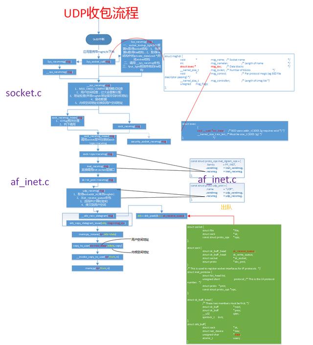 协议无关层和系统调用接口层:当用户需要接收数据时,首先根据文件描述符 inode 得到 socket 结构体和 sock 结构体,然后从 sock 结构体中指向的队列 recieve_queue 中读取数据包,将数据包 copy 到用户空间缓冲区。数据就完整的从硬件中传输到用户空间。这样也完成了一次完整的从下到上的传输。